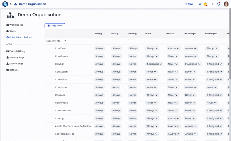 We are also adding the ‘Can View’ action to the permissions that can be configured for each role. This will give you more control over who can see what within a workspace. For example, you could create an Intern role that can only see Experiments they have been explicitly assigned to, or only experiments in particular Collections they have been assigned to (by using the new setting above).