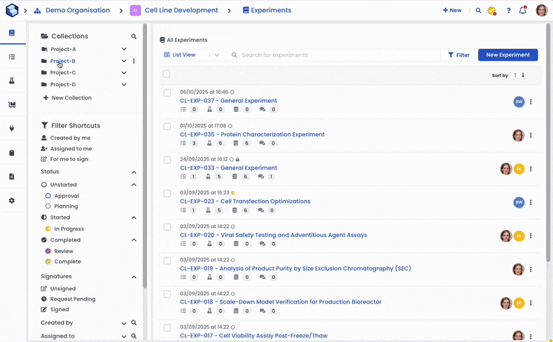 We are also introducing the ability to assign users to entire collections of experiments or protocols. This can be used in conjunction with the changes to the permission model (see below) to control which users can see and perform actions on particular collections of experiments or protocols.