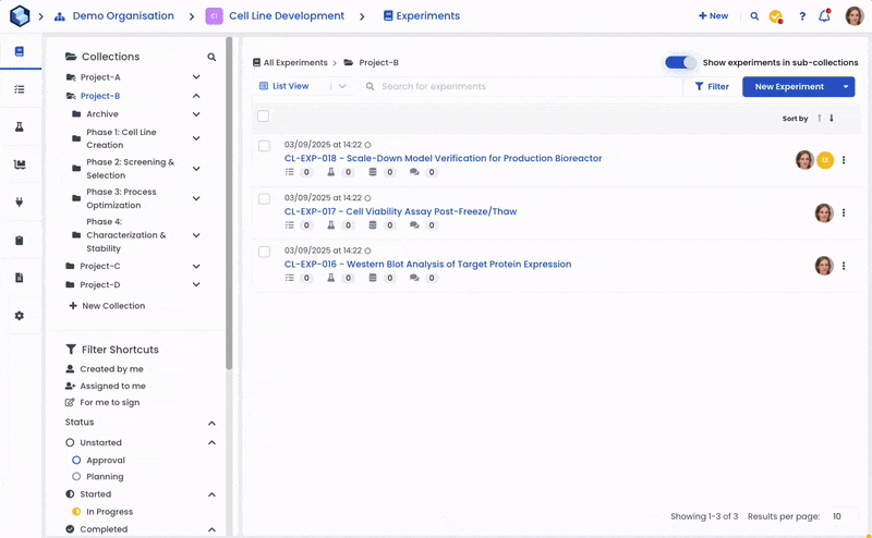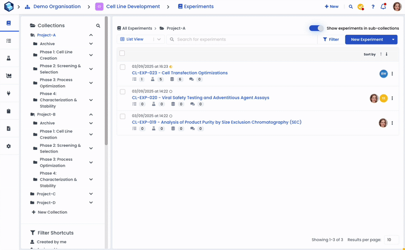 Previously, filtering your experiments by a particular collection would only show you experiments added directly to that collection not including any experiments in sub-collections. Now we are introducing a toggle to allow you to show or hide experiments in sub-collections when filtering by collection.